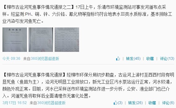 3月17日下午,乐清市柳市镇官方微博针对死鱼事件发出了两则通报: