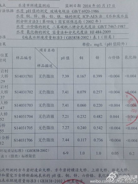通报二,乐清市环境监测站对事发河道布点采样,经监测:PH、铜、锌、六价铬、氰化物等指标均符合地表水Ⅲ类水质标准,基本排除工业污染引发河鱼死亡。此条通报还附上了监测报告。