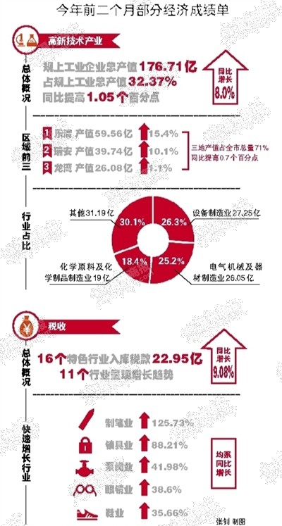 今天,“集结号”再次吹响,第二次全市振兴实体经济大会拉开序幕。回顾这半年,我市各经济领域都奏出了一些“强音”。从今年前二月的数据来看,高新技术行业成功实现开门红,产值保持较快增长;制笔、锁具、泵阀、眼镜、鞋业等我市特色行业税收同比分别增长125.73%、88.21%、41.98%、38.60%、35.66%。(记者 刘娜筱 通讯员 王玉祥)