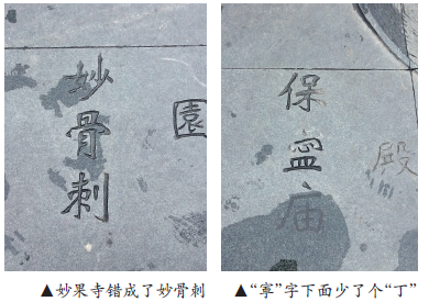 “五马街西入口的温州古城图上,有好几处错别字:‘妙果寺’写成了‘妙骨刺’,‘天寕寺’的‘寕’下面少了一个‘丁’。”昨日,市民刘先生反映此事。他觉得,五马街这样的旅游景点存在这样的错误,是给创建历史文化名城“抹黑”,希望引起有关部门重视。
