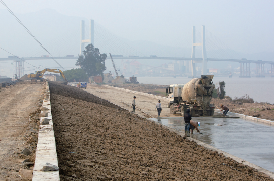 昨天,几名工人正在七都环岛“百年一遇”防洪堤塘吟州堤段现场施工。