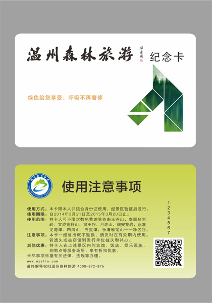 温州森林旅游一卡通(以下简称“一卡通”)特为纪念3·21国际森林日而作,限量发行30万张。温州市民或游客只须缴纳100元年费,在市民卡上开通相应功能或者办理“一卡通”纪念卡,在2015年3月20日前,便可享受不限次数使用、游览温州十大指定森林景区的福利(十大景区门票原价总计585元),直接在景区入口处检验进入。
