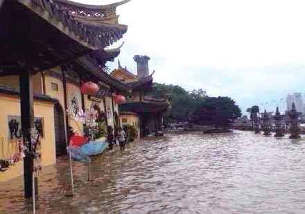 2、潮水入侵。江心寺的地面多为花岗岩铺设,不怕江水肆虐。但柱子多是木结构,虽然每根柱子底下都有一个石头制成的柱础,高约30厘米。但近些年来,由于环境等外部因素变化,潮水水位明显上升,严重时水位近1米,对木柱产生极大危害。