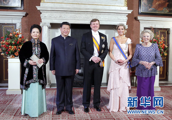 当晚,威廉-亚历山大国王在王宫为习近平举行盛大国宴。王宫内水晶灯辉煌,郁金香花绽放。威廉-亚历山大国王、马克西玛王后、贝娅特丽克丝前女王共同迎接习近平和夫人彭丽媛到来。两国元首同双方嘉宾握手,互致问候。