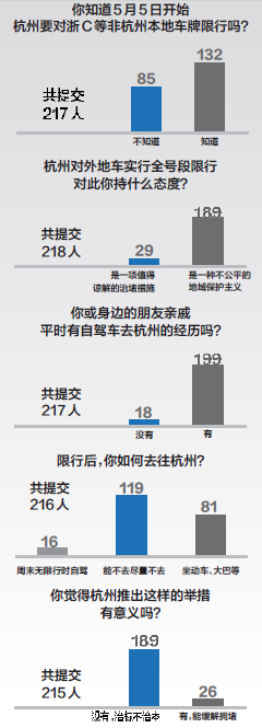 昨日,记者在网上就“杭州限牌限行,你怎么看”进行民意调查,有200多位热心市民参与。结果显示,多数受访者认为该政策并不合理。