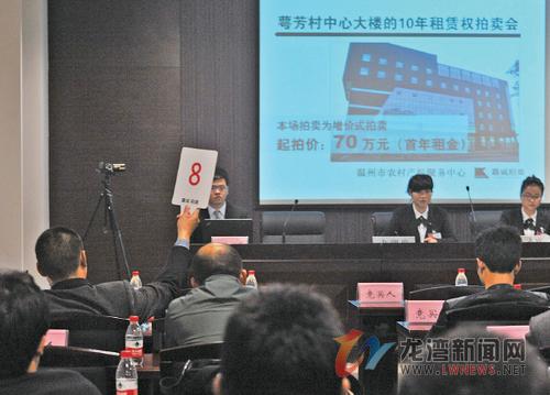 温州网讯 “首年租金起拍价70万元,每次叫价2万,现在拍卖正式开始。”上午10点,由温州市农村产权服务中心主办的龙湾区永兴街道萼芳村中心大楼10年租赁权公开拍卖会开始。据悉,这是温州首宗农村集体资产使用权的拍卖。