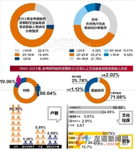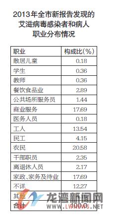 从新报告的感染者和病人职业分布来看,农民排在第一位,涉及各类人群,提示我市艾滋病从高危人群向普通人群扩散趋势明显。从户籍分布来看,2013年全市新报告发现的艾滋病毒感染者和病人仍以本市户籍为主,约占66.1%。