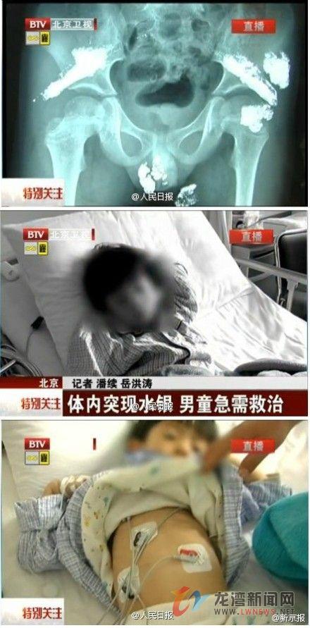 【男童体内疑被灌大量汞臀部挤出水银珠】昆明5岁男童体内突然出现大量水银物质,已经一个星期未进食,情况危急。家长于先生说,检查发现,儿子体内汞含量严重超标,血液里超高200多倍,尿液里超高1万多倍。目前,医院正想办法救治。这么大量的水银,怎么会进入孩子体内?