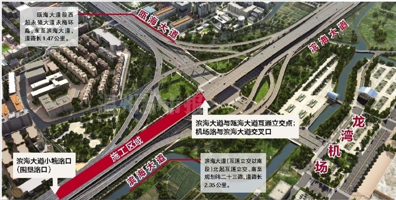 根据交警部门统计,目前瓯海大道机场出口平均每天的车流量达到了8.4万辆车次,滨海大道机场口处日均车流量达到了6万辆车次,日均出入机场的车流量在2万辆左右。而瓯海大道东延工程的建成,将大大改善该处的交通情况。