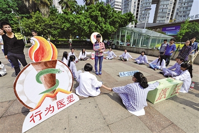 日前,温州医科大学学生,在市区松台广场举行了一场名为“行为医塑”的行为艺术活动,呼唤和谐医患关系。杨冰杰摄