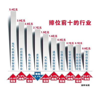 分行业看,在34个行业中,今年有26个行业实现全行业盈利,比去年减少了3个,利润实现正增长的行业数量则与去年相同,均为15个。其中,十大重点行业集中了利润总额的88%。电气机械和器材制造业、纺织服装和服饰业、电力和供应业分别以实现利润5.4亿元、3.8亿元和3.6亿元,成为“最赚钱”的三个行业。变化最为显著的,是作为头把交椅的电气机械和器材制造业,去年同期仅实现利润3.46亿元,而今年开年就突破了5亿元,幅度变化也从降幅25.89%转为增幅53.8%。