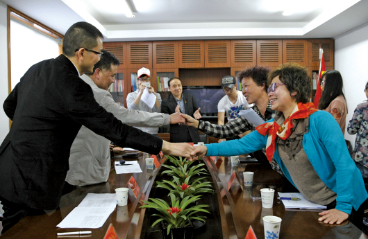 昨天下午,在鹿城区委宣传部召集的“圆桌会议”结束后,新国光商住广场业主和(广场舞)文体团队代表握手言和。3月29日,新国光业主因不堪广场舞的噪音,集资约26万元买来“高音炮”跟来自松台广场广场舞的噪音“对决”。鹿城区于4月1日启动全国范围对策征集。有关部门昨表示,未来几天会尽快制订方案,促使事情圆满解决。温都见习记者黄攀/摄