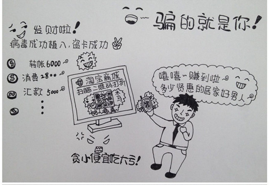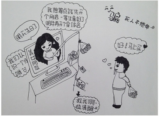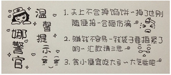 “天上不会掉馅饼,掉了也别随便接,会砸伤滴!赚钱不容易,钱袋子要捂紧了呦,汇款要三思!贪小便宜吃大亏,大气些吧!”萌女警朱雪娜手绘漫画第三季为你“掀起骗局的盖头来!”亲们,你中过招吗?千万要擦亮眼睛看仔细哦!