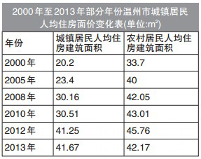 3月25日,温州市统计局和国家统计局温州调查队发布的《2013年温州市国民经济和社会发展统计公报》显示,截至2013年年末,温州市城镇居民人均住房建筑面积41.67平方米,农村居民人均住房面积为42.17平方米。城镇居民人均住房面积较上年41.25平方米高了0.42平方米,农村居民较上年少了3.59平方米。