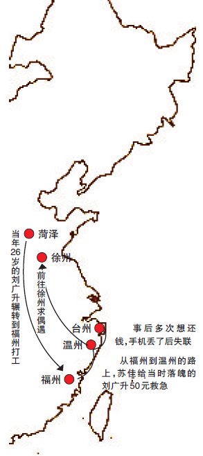 4月2日,在温州经商的刘广升和往年一样回山东老家准备过清明节,但今年他途经江苏徐州时,特意停留了下来,在他印象中,他苦寻多年的恩人苏佳的家乡就是徐州。10多年前,他只是个流落他乡落魄的小伙,如果不是路遇比他小几岁的年轻姑娘苏佳,给了他50元临时救急,他不敢想象后果会怎样。这雪中送炭的50元改变了他一生,如今事业有成的刘广升为答谢恩人,四处搜寻苏佳的下落,想跟她说声谢谢。