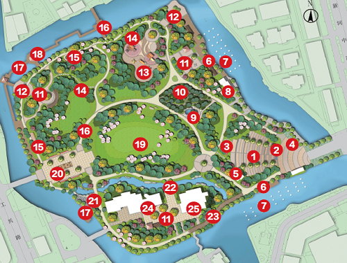 在总体景观功能框架上,鳌江公园主要呈现“两轴、两带、七区”——两轴,是指主入口景观轴、次入口景观轴;两带,是指滨河景观带、河道景观带;七区,是指入口广场区、阳光草坪区、文教休闲区、山体景观区、儿童活动区、健身活动区、滨水景观区。