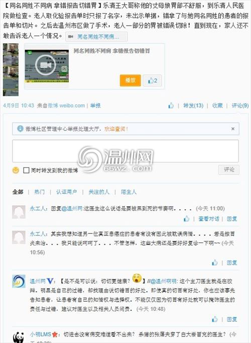 4月9日,乐清2人同名同姓不同病拿错报告三分之二胃被误切的新闻一经发出,引起不少网友的议论。事件发生后,两家医院都采取了哪些措施?为患者实施手术的温州医科大学附属第二医院表示,一系列过程都是按正常的流程实施的,不存在过失。乐清人民医院已决定通过司法途径来解决本次纠纷。