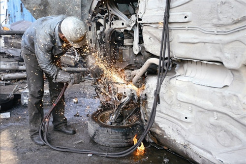 昨天,温州浙南汽车设备回收有限公司内,一名工人正在拆解一辆淘汰的“黄标车”。