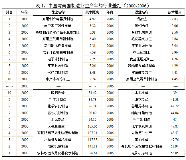 “唱衰中国”的论调中永不衰落的一个依据在于中国经济增长主要依赖于高投入而非技术进步,以克鲁格曼先生为代表的唱将们认为中国经济增长就是纸老虎。但根据林毅夫与任若恩的研究:克鲁格曼对生产率的估算低估了中国生产率水平,技术进步尤其是技术引进在中国经济增长发挥了重要作用。Brandt、Biesebroeck等人在最新的研究成果中对中国生产率重新进行了核算发现:中国生产率增长率达到7.96%,中国经济高速增长中技术进步起到了关键作用。这些发现均对“唱衰中国者”进行了有力的批驳。根据丁赛、孙浦阳与蒋为在最新研究中对中国制造业行业与美国生产率之间差距进行估算得到的结果(如表1)所示,中国与美国在制造业上的差距正出现迅速的降低,中国在几乎所有制造业行业均呈现出技术赶超趋势。这也应正了林毅夫的研究,中国将凭借技术上的后发优势,通过技术进步促使经济保持在更长期内持续增长。“唱衰中国”论调显然只是一只只纸老虎。