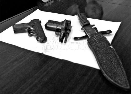 温州网讯 两把塑料手枪、两把匕首、十四个烟花爆竹、两个口罩、两双手套、一条登山绳、一卷双面胶。这是两个劫匪准备的作案工具。他们“渡河”潜入温州市区世纪锦绣园要抢劫,结果作案未遂离开小区后落网。