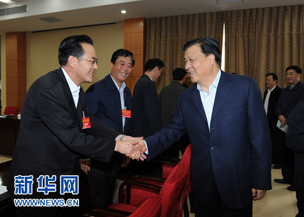 4月16日,中共中央政治局常委、中央书记处书记刘云山在北京主持召开省部级干部学习贯彻习近平总书记系列重要讲话精神研讨班学员代表座谈会并讲话。这是座谈会开始前,刘云山同研讨班学员代表亲切握手。 新华社记者 饶爱民 摄
