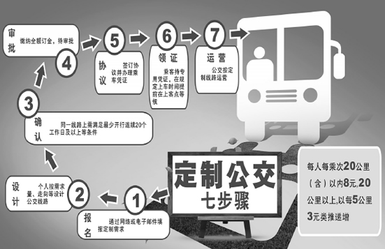 “定制公交”分报名、设计、确认、审批、协议、领证、运营等七步运营。乘客可通过网络或电子邮件方式填报定制需求,单位需洽谈、协商设计定制公交线路;个人按需求量、走向等设计定制公交线路,同一线路上需满足最少开行周期(连续20个工作日及以上)、最少规模人数(大客车按车辆核定载客人数的70%及以上)、最少来回趟数(一天内来回各1趟及以上)、上客点数不超过上限(3个)等条件时,就可组织“定制公交”线路设计,并预先缴纳全额订金,待管理部门审批后,签订协议并办理乘车凭证。最后,乘客持专用凭证,在规定上车时间提前在上客点等候,定制公交将按定制线路开展运营服务。