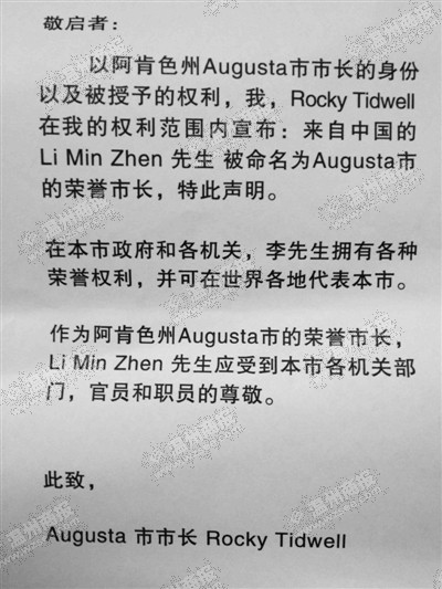 记者看到荣誉函的内容中写道:“敬启者:以阿肯色州Augusta市市长的身份以及被授予的权利,我,Rocky Tidwell在我的权利范围内宣布:来自中国的Li Min Zhen先生被命名为Augusta市的荣誉市长,特此声明。在本市政府和各机关,李先生拥有各种荣誉权利,并可在世界各地代表本市。作为阿肯色州Augusta市的荣誉市长,Li Min Zhen先生应受到本市各机关部门,官员和职员的尊敬。此致,Augusta市市长Rocky Tidwell。”(摘自原文翻译)