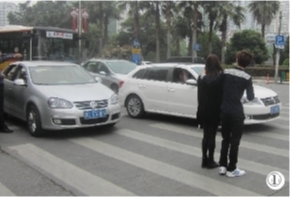 ①、雁荡西路上一无信号灯路口有机动车未让行人