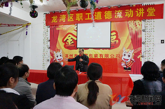 龙湾新闻网讯 4月21日,龙湾区职工“道德流动讲堂”第一站走进状元街道曙霞包装有限公司。此次讲座邀请了龙湾区教师退休协会会长、区传统文化促进会讲师张周法老师讲课,温州市曙霞包装有限公司100多名职工参加。