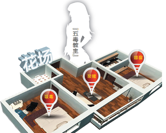今年4月中旬,张某以一年2万元的价格,从他人手中租下一间商品房,开始了她的“发财大计”。她先是在里面以“牌九”的形式,吸引赌徒来聚赌,她则以3%的比例抽取赌资。之后,又增加了介绍容留卖淫的“项目”,每次抽取100元。尝到“甜头”,她再次动起歪脑筋,将剩下的一个房间,成为供人吸毒的窝点,以每次50-100元不等的价格,从瘾君子手中收取“场地费”。为使“服务”更加周到,张某还专门雇佣了一个男子,在里面打扫卫生、烧点心等。短短几天时间,张某从该窝点中获利2万元。为了使自己显得更“霸气”,张某照着“笑傲江湖”里的人名,给自己取了一个“五毒教主”的外号。而该商品房,也被人叫做“花场”。