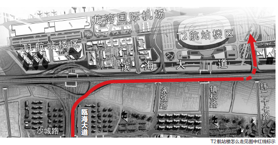 “市民有两种方式进入T2航站楼,一种是走高架,从市区过来的市民可沿瓯海大道段靠右行驶,沿匝道进入瓯海大道—滨海大道互通式立交,再进入滨海大道(互通立交以南段),行驶至滨海大道纬二十七路路口时,再靠右进入通往T2航站楼的匝道,随后便可直达T2航站楼。另外一种途径就是走地面道路,从瓯海大道右拐进入滨海大道后,也是在纬二十七路路口左拐进入T2航站楼。”李俊雄介绍。