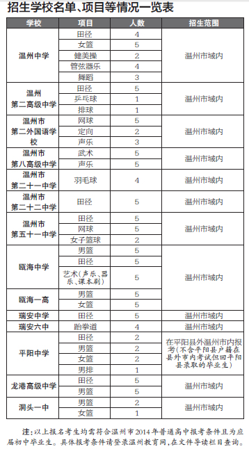昨天,温州市教育局通过温州教育网(http://www.wzer.net)公布2014年全市14所普通高中面向全市招收体育、艺术特长生的招生项目及名额。此次招收特长生总人数为120人,其中温州中学招收18名体育和艺术类的特长生,人数最多。具体的报名地点和方式,家长和考生可向学校了解。