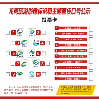 龙湾旅游主题宣传口号和形象标识(LOGO)经初步筛选、社会公开评选、专家组成评审等环节,已评出入选作品旅游主题宣传口号10条,旅游形象标识(LOGO)10个。现将入选作品进行公示,并邀请广大市民参与投票,选出最代表龙湾旅游形象的口号和标识,并提出宝贵意见。