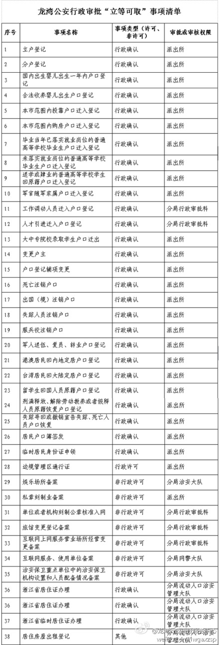 近日龙湾区公安分局推出38项“立等可取”行政审批事项,涉及户口、身份证、特种行业、居住证等项目,审批权限涉及行政审批科、治安大队及派出所等多个部门。方便群众办理审批事项,提高办事效率,深化“美丽公安窗口”品牌建设。