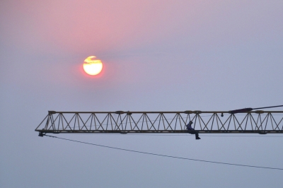 昨天下午,男子仍坐在塔吊吊臂上。记者赵思衡摄