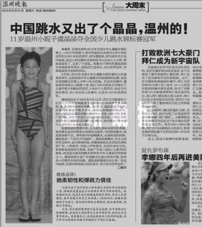 据悉,在2013年全国少年儿童跳水锦标赛上,刚满11周岁的虞晶晶勇夺女单3米板冠军和女双5米台的亚军,她过人的天赋和全面的技术让业内人士大呼:郭晶晶退役了,又来了个晶晶。而晶晶表示,成为世界冠军、向郭晶晶看齐是她的目标。