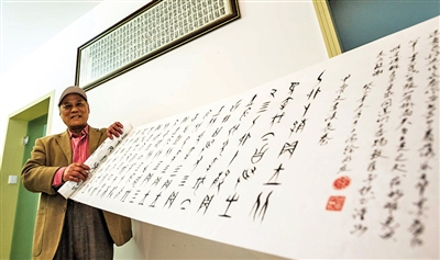 徐永友老人在展示他历时近一年半写就的120米长的甲骨文书法长卷《千家诗》。赵用摄
