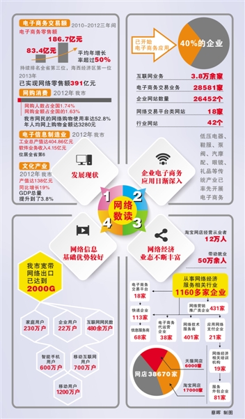 据市商务局统计,2013年,温州实现网络零售额391亿元,同比翻一番。其中,网络经济最硬码的指标——快递发件量,去年达到1.37亿件,同比增长53.4%,位居全国城市排名第13位。今年甫一开年,温州网络经济又迎“开门红”,据全省网络零售市场统计表明,1至2月温州市共实现网络零售额75.42亿元,同比增长72.78%。
