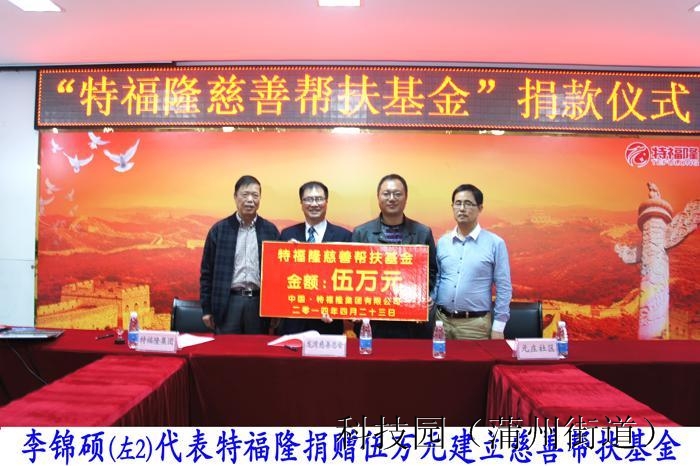出席特福隆捐款仪式的有龙湾区慈善总会殷国兴会长、秘书长金相如,高新区科技园(蒲州街道)管委会副主任林光新等领导,元庄社区党委书记王凯成与特福隆集团党总支书记、常务副总经理李锦硕出席捐赠仪式。特福隆集团作为捐赠单位,龙湾区慈善总会作为接收单位,科技园(蒲州街道)元庄社区作为使用单位,三方共同签订协议书共建文明和谐社区。
