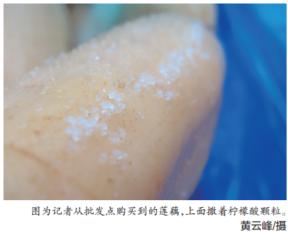离开后,记者对刚购买的莲藕进行拍照。取莲藕时,记者手指触碰了融化的柠檬酸,液体渗入指甲缝,感到一阵灼伤感。