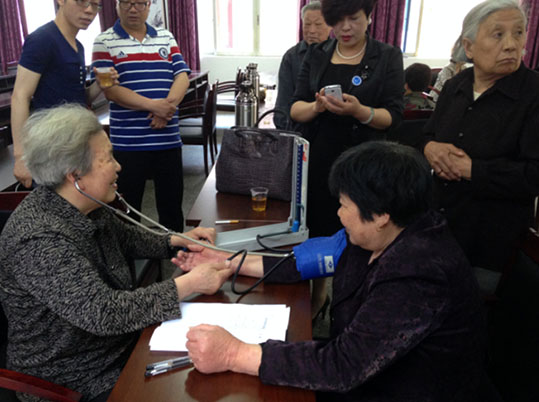 当天,来自镇南卫生室姜凤菊作为社区老年志愿者,免费为老人开展血压测量并记录。