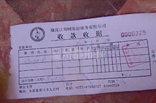 该网友发出的微博照片中,有一张是“楠溪江甸园旅游服务有限公司”的收款收据。该收款收据单上明确标注款项内容为“场地费”,单价一栏写着“2”,数量一栏为“5”,共计10元。