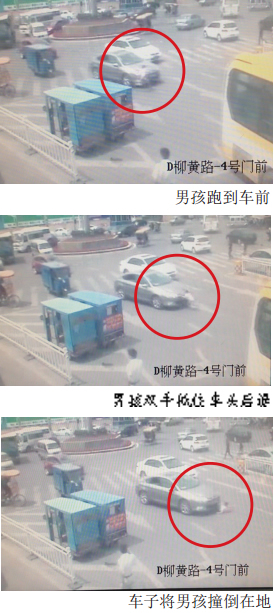 13时16分53秒,孩子撞上雪铁龙,起先他还用双手抵住车头,后退了几步,但很快便被撞倒在车头前,雪铁龙继续向前行驶;