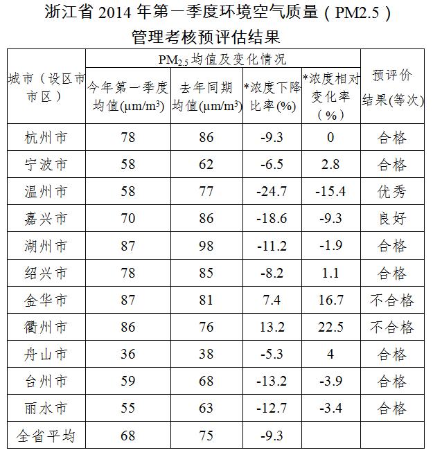 2014年第一季度,全省11个设区城市中预评估优秀城市1个(温州市),良好城市1个(嘉兴市),合格城市7个,不合格城市2个(金华市、衢州市)。