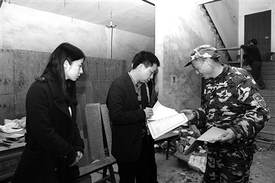 刘发发把专业设计的消防图纸拿给邢文东(左)看。雷忠义摄