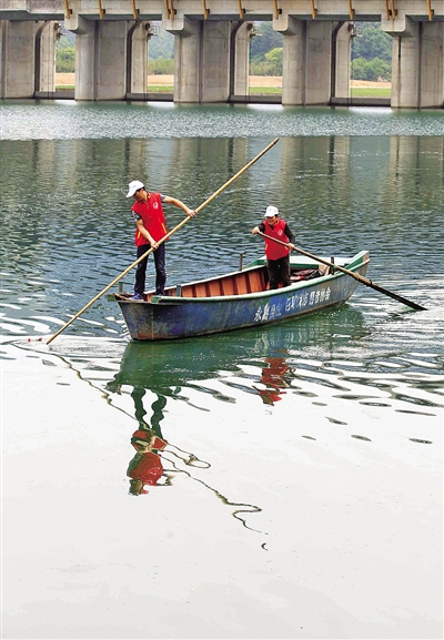 朱启省和朱百善划着小船打捞楠溪江上游飘下来的生活垃圾。陈翔摄
