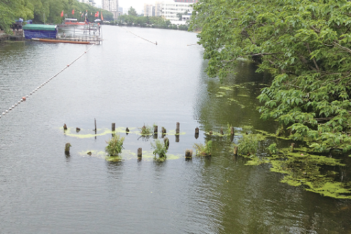 施先生在一旁解释,近来常下雨,水位较高,等到水位低一些的时候,可以看到沙袋和更多的木桩。他怀疑这些木桩是九山公园二期工程施工时所留下来的建筑垃圾。“工程已经完工一年多了,为什么这些木桩却没有同时清理?”
