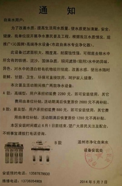 就在常先生小区这两天被“啤酒”困扰的时候,小区内出现了一张落款为“温州市净化自来水设备安装处”的通知,向小区居民推荐“市政自来水专业净化器”。