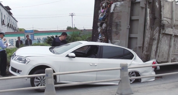 眼看着垃圾车翻过来 司机加大油门躲过一劫