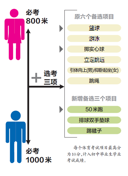 今年中考体育测试分值由原来的30分提高至40分,因此市教育局在此前的基础上,新增50米跑、排球双手垫球和踢毽子3个备选项目,选考项目也从之前的“6选2”变为“9选3” 。